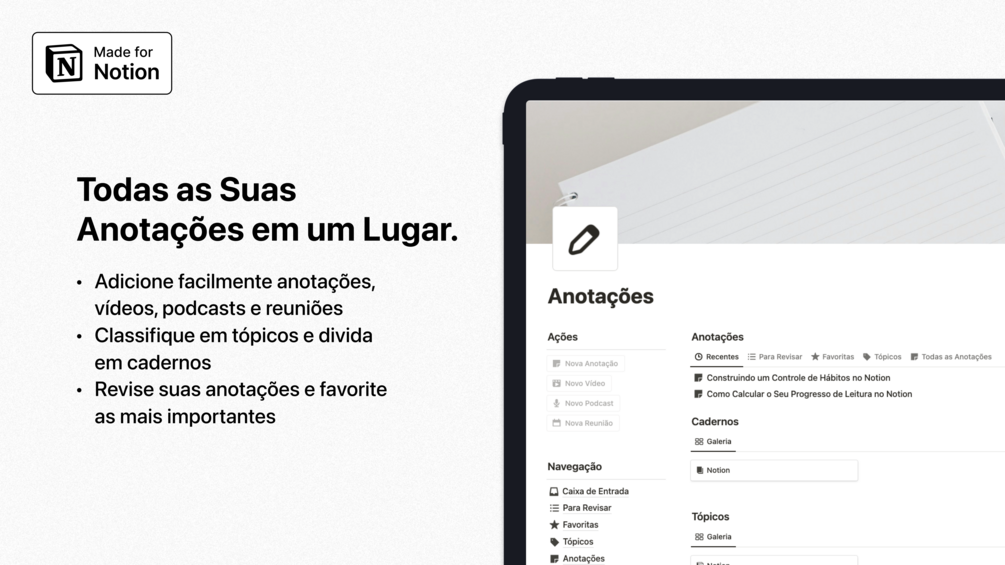 Chega de usar bloco de notas ou post-its e perder coisas importantes do dia a dia. Com o template de Anotações, você consegue organizar tudo em um único lugar, dividindo seus registros por tópicos e criando cadernos. Separe o que é importante e descarte anotações rápidas que não são mais necessárias.