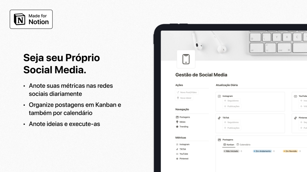 Esse template otimiza a gestão de redes sociais ao permitir a análise detalhada de métricas individuais, a organização de postagens em um quadro Kanban e calendário, e a anotação de ideias importantes para impulsionar seu crescimento. Ideal para influenciadores e gerentes de mídia, ele centraliza tudo que você precisa para uma estratégia eficiente e bem-sucedida.