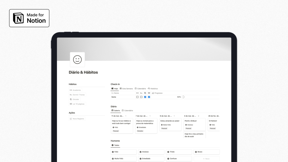 Todos os dias você fará um check-in marcando os seus hábitos como concluídos e calculando o seu progresso automaticamente. Além disso, você poderá ter um diário pessoal, de estudos, trabalho ou qualquer outro que preferir para registrar acontecimentos importantes e o seu humor no dia!