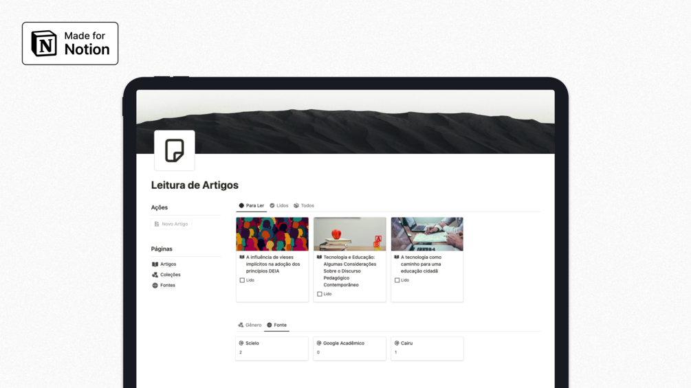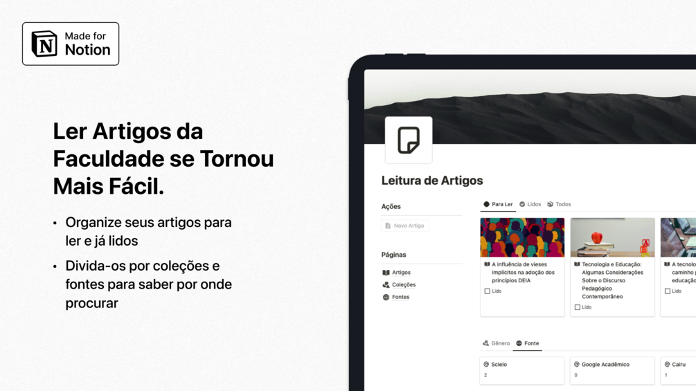 As vezes fica complicado de salvar todos os artigos que o professor passou, mas com este template de Leitura de Artigos, você consegue organizá-los em um só lugar, dividindo por coleções e suas fontes e sites preferidos!