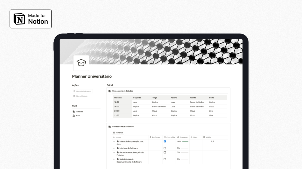Com o Planner Universitário, você consegue ter o seu cronograma de estudos e aulas organizado e também pode integrar com o seu Calendário do Notion! Além disso, você pode registrar todas as suas cadeiras e respectivas matérias, calcular o seu progresso e a sua média de notas de forma simples. Comece a sua vida de estudante hoje e se organize de forma produtiva!